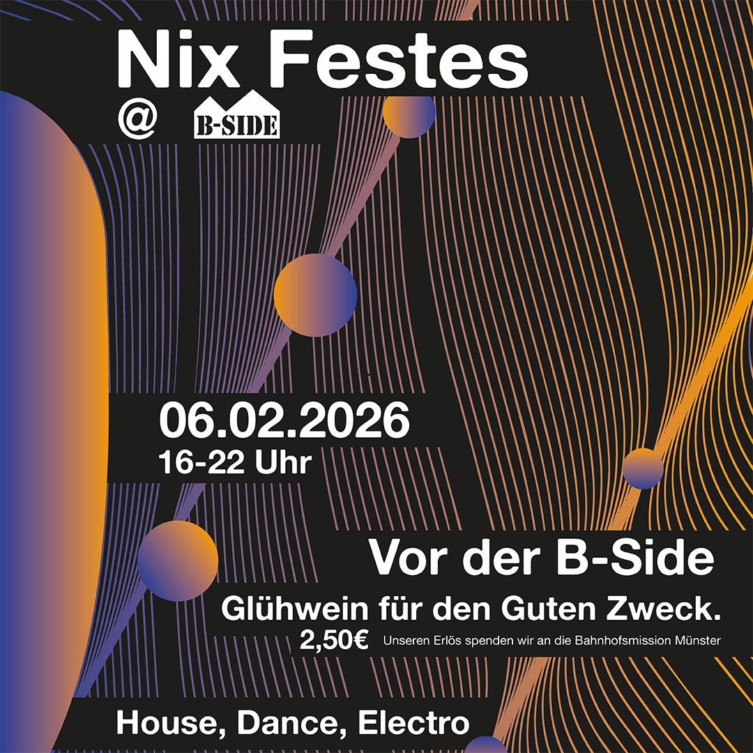 Vor der B-Side gibt es elektronische Musik und Glühwein (2,50€) für einen guten Zweck.Der Erlös wird an die Bahnhofsmission Münster gespendet.