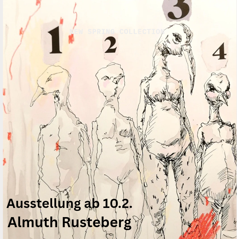 In der aktuellen Ausstellung „LoOk at mE - a wILD MiX“ zeigt Almuth Rusteberg eine Auswahl ihrer Portraits, die sich u.a. mit Gesichtern der Stadt beschäftigen, inspiriert sind vom Modedesigner Alexander McQueen und Arbeiten aus ihrer Serie „Freies Denken“, die das „Sein dürfen“ thematisieren. Die Künstlerin lebt in Wettringen und arbeitet dort in ihrem „Atelier Alte Apotheke“. Ihre Arbeiten zeichnen sich durch eine unverwechselbare Handschrift aus. Ihre Werke haben auf den ersten Blick etwas Skizzenhaftes und Umreißendes. Doch bei genauerem Betrachten offenbaren sich erstaunlich detailverliebte Elemente. Ihr lockerer und schneller Strich, zusammen mit dem mutigen Einsatz von Farbe, verleihen ihren Werken die starke Ausdruckskraft. Bei ihren Portraits gelingt es ihr die Emotionen der dargestellten Personen einzufangen und gekonnt auszuformulieren. Meist verbindet sie mehrere Techniken und Materialien. So nutzt sie Tusche, Fineliner, Bleistift, Buntstift, Kreiden, Aquarell und Acryl. Es scheint, als würde alles, was ihr in die Hände kommt und zu ihrem Motiv und Ausdruckswünschen passt, in das Bild eingearbeitet werden.